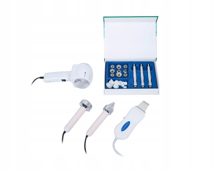 Multifunkcjonalny kombajn kosmetyczny, za pomocą którego można przeprowadzić zabiegi: mikrodermabrazji diamentowej, peelingu kawitacyjnego, światłoterapii i ultradźwięków. Dodatkowe funkcje to głowica ciepło/zimno oraz darsonval.