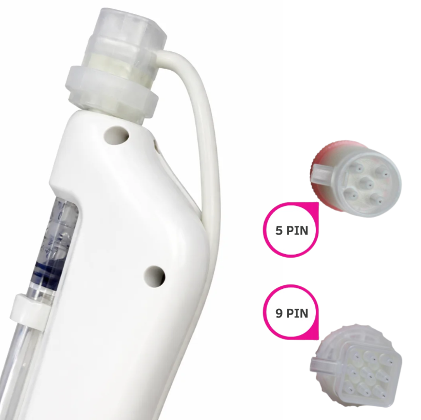 Automatyczny injektor z funkcją próżniową został zaprojektowany do profesjonalnych zabiegów kosmetycznych. Urządzenie wykorzystuje technologię automatycznej aplikacji substancji aktywnych, dzięki czemu umożliwia precyzyjne, równomierne i kontrolowane opracowanie skóry. Pracuje z kartridżami wieloigłowymi 5- lub 9-igłowymi, co przyspiesza przebieg zabiegu i zwiększa komfort pracy. Funkcja próżniowa wspiera lepszy kontakt aplikatora ze skórą oraz dokładniejszą aplikację.